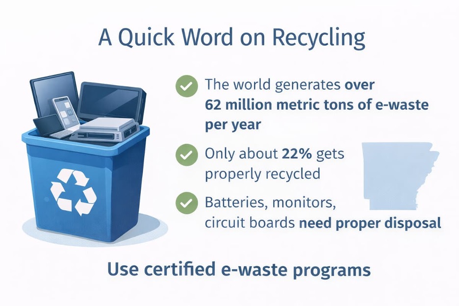 If it’s being recycled, use a certified e-waste provider, not the dumpster or the curb. One thing worth knowing: Best Buy’s popular recycling program is for household residents only, not businesses.