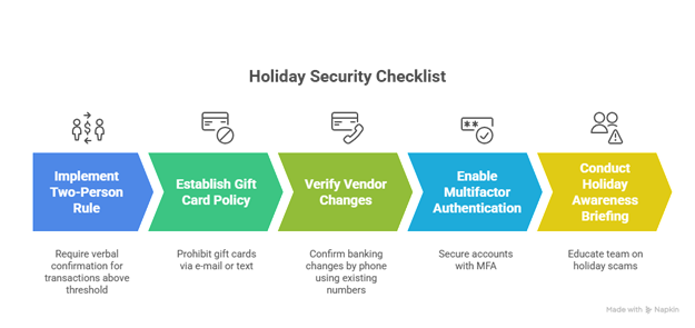 The holidays should be about growth and celebration, not cleaning up wire fraud. A staff huddle, a handful of smart policies and a few layered protections go a long way toward keeping criminals out of your books.